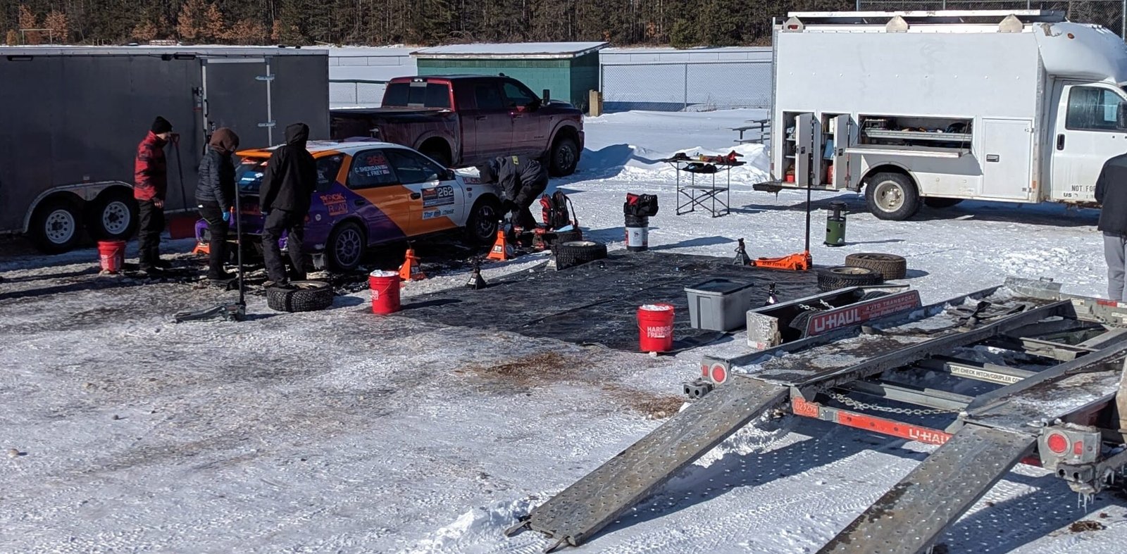 Roughly a day or two before the start of competition, the team arrives for the rally. Crew is responsible for getting the car through technical inspection and prepping equipment for the race.